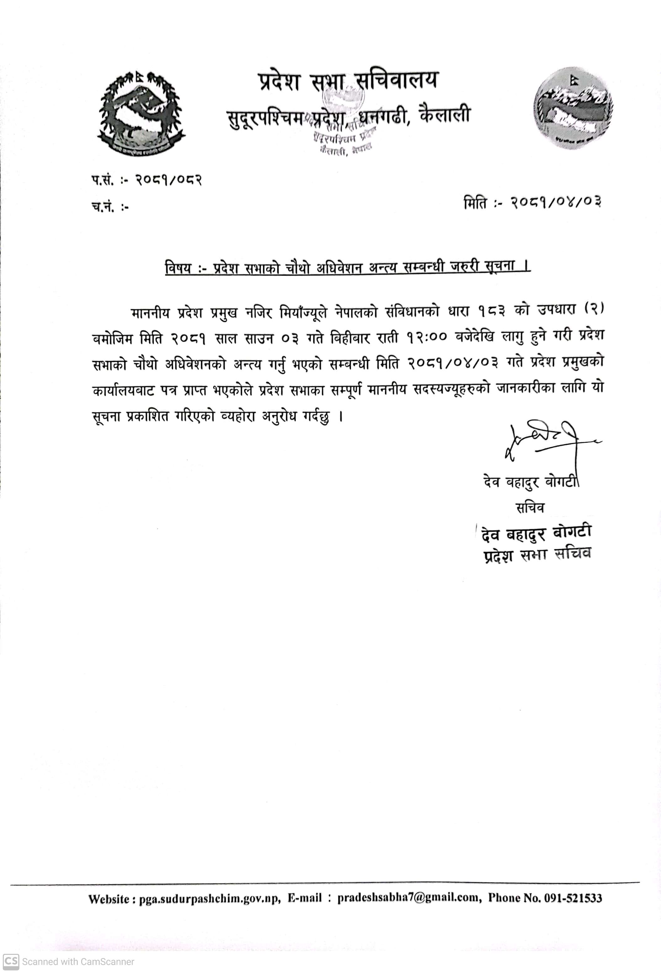 सभाको चौथो अधिवेशन अन्त्य सम्बन्धी सूचना