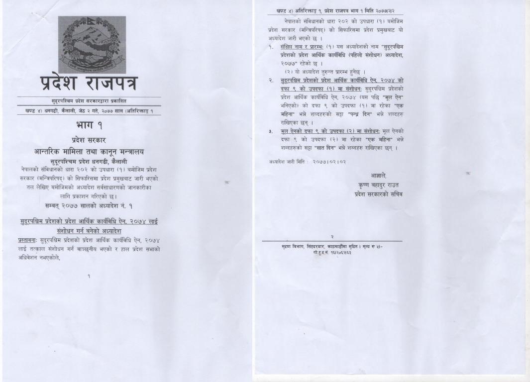 सुदूरपश्चिम प्रदेशको प्रदेश आर्थिक कार्यविधि ऐन, २०७४ लाई संशोधन गर्न बनेको अध्यादेश